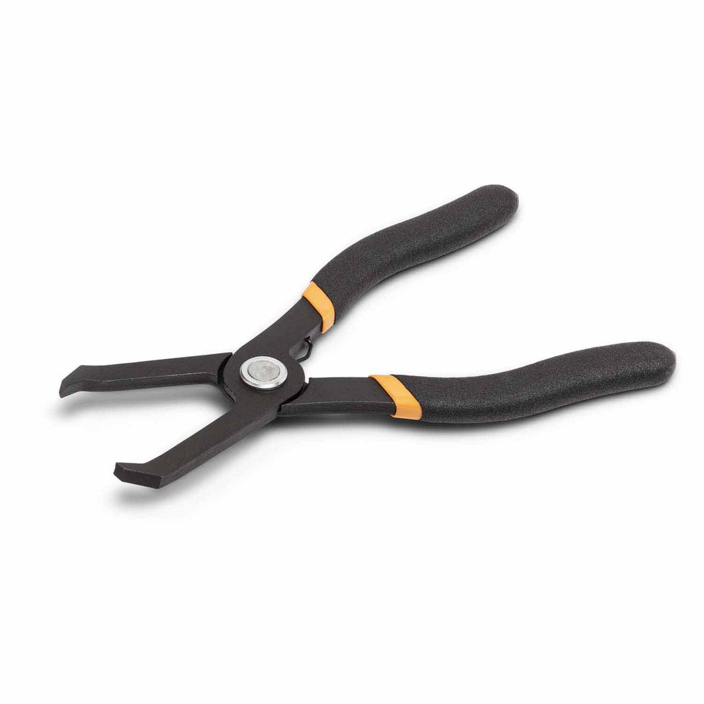 The Gearwrench 30 Degree Push Pin Removal Pliers are designed for efficient removal of push pins with center locking pins, featuring a 30-degree offset for easy access.