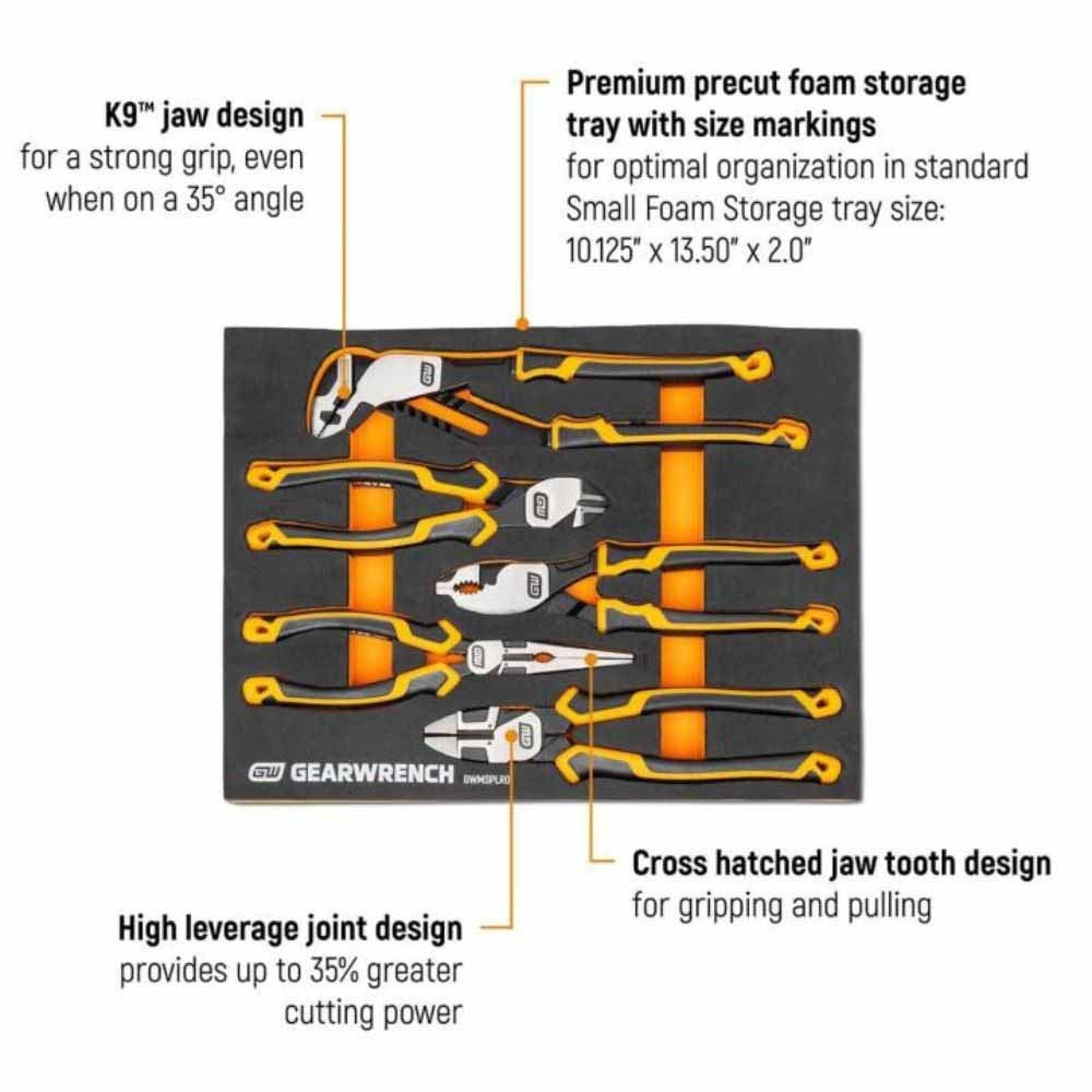GEARWRENCH mechanics tools have been designed with professional users in mind for better productivity, access, and strength. The 5 piece PITBULL cushion grip pliers set in foam storage tray is one of the wide collection of GEARWRENCH Modular Sets. These chemical and solvent resistant foam trays are designed to fit in a wide range of tool storage systems, including our GSX storage line of products. The foams are in contrasting orange and black with high visibility size markings for easy tool identification. Each of the tools fits in a custom cutout that provides optimal protection, organization, and accessibility.